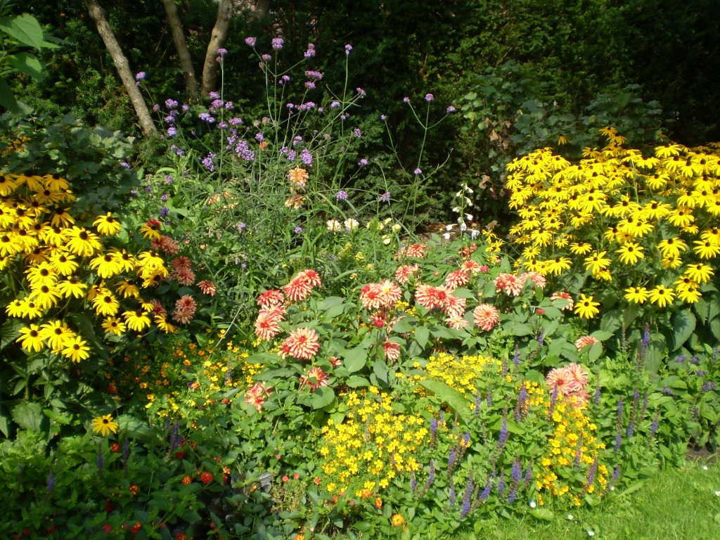 Staudenfläche; Rudbeckia, Günzel und Salbei, ergänzt mit Sommerblumen